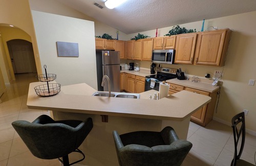 Located about 20 to 30 minutes to Walt Disney World resort, and about 40mins to an hour to the Universal parks. This amazing 4 bedroom home cones with a king master with ensuite, queen master with en-suite, and two bedrooms with two twin beds in each. The home features an in-ground swimming pool and spa. All of the bedrooms have their own Roku installed flat screen TVs with access to the YouTube TV service. Recently we just upgraded our internet to super fast 1 gigabit fiber service with extra coverage around the home! The open plan style offers living room, kitchen, dining room and breakfast nook as well as patio doors leading to the private pool and spa with lanai with no rear neighbors. In the living room area, we have a large LG flat screen TV with a Roku Streambar Pro and Subwoofer. There is an awesome game room with a 4 player arcade unit that features countless amounts of classic arcade games and a separate Marvel Arcade1Up virtual pinball table. In addition, the room has a pool table, bubble hockey and foosball table.