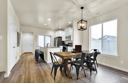 Highland Haven is the ultimate modern farmhouse lovingly named after the cute Highland cow art featured in the cozy living room. Just off the main living are is an office nook perfect for remote work and school, or a fun coloring space for kids. Summer is just around the corner! The neighborhood has a community park and pool (open seasonally typically Memorial Day to Labor Day, weather dependent) and is near Settler's Park. As the weather cools down warm up on the patio with the propane firepit while you play some yard games - Jumbo Jenga or Cornhole with our custom Idaho boards! This 3 bedroom, 2.5 bathroom home sleeps 8 making it perfect for families or groups of friends. Just down the street from the neighborhood entrance is the expansive Settler's park featuring baseball fields, horseshoe and pickle ball courts, a large playground with swings and splash pad, and a seasonal disc golf course ( typically open November-February). A few miles away is Meridian's outdoor mall, The Village, or Roaring Springs Water Park and Wahooz Family Fun Zone. If you want to branch out of Meridian enjoy quick freeway access for exploring more of what the Treasure Valley has to offer!