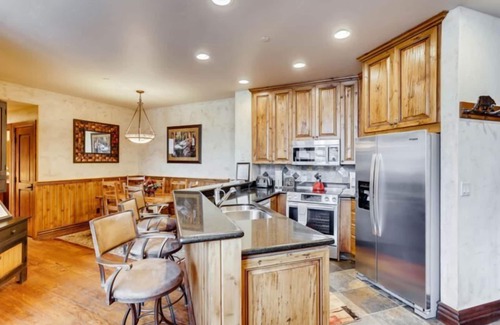 This Platinum, ski-in, ski-out, two-level residence, finished in classic, western lodge style, offers a great room with floor-to-ceiling windows and a wood burning fireplace, an upgraded chef’s kitchen with stainless steel appliances and granite countertops, a dining area for eight, and three guest suites, each with a lavish, attached bathroom (the first has a king size bed, the second has a queen size bed, the third has two twin beds). Additional features include a lofted family room with a flatscreen TV and game table that adjoins a fourth guest suite with a king size bed and desk; a stacked washer/dryer; garage parking for one vehicle; and access to a ski locker with boot heater.