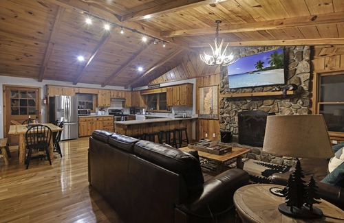 Inside the cabin, Bear Paw Hollow has been beautifully renovated with new custom furniture. The ceilings and floors are covered in knotty pine throughout the cabin. The kitchen features wood cabinets, granite countertops and a large peninsula with plenty of space. The family room has new leather couches, a 65 inch television and a wood burning fireplace. All 3 bedrooms feature King beds and fans in each room. Downstairs in the game room there is a futon that turns into a queen bed that's perfect for an additional sleeper. There are 3 full bathrooms and all have been newly renovated.