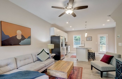 This private, comfortable, new construction home is less than 10 minutes from downtown Asheville and Haywood Road Corridor (West AVL or "Locals Downtown"). Nature-filled 1/2 acre backyard has all the privacy with a fire pit, Adirondack chairs and often a gaggle of wild turkeys. Spacious deck ready to enjoy our perfect climate. Open floorplan on main level and bonus room upstairs complete with a large table ready for remote work and board games after a long day of adventure.