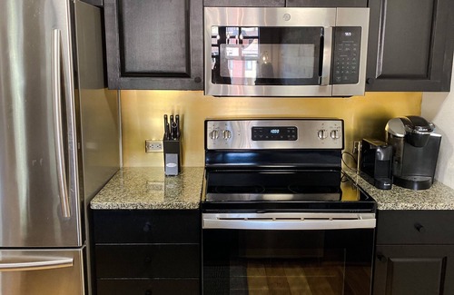 This newly renovated top floor retreat has beautiful views, new furniture and appliances, real hickory walls and flooring, and a fully stocked kitchen with new stainless steel cookware.