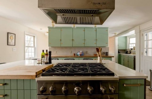 We hope you will love cooking and baking (and maybe dancing?) in the chef’s kitchen. There is a gas range, a convection oven, two sinks, all the kitchen essentials and appliances, and a huge island for all to gather around. The island comfortably seats 6 and at least 2 more have been squeezed in with no problem. It’s so nice to fire up the wood stove in there and spend the day hanging out and creating delicious food. In addition to the main kitchen area, there is a butler’s pantry - a separate area with a sink, a dishwasher and extra cabinets. Here you will also find fixings for coffee and tea. In the dining room, there is a gorgeous custom built farm table if you want to have a ‘grown-up’ meal or spread out with a puzzle.