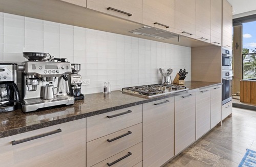 This villa is located on the top floor and is designed to have everything that you need for your Hawaiian Beach Vacation. As soon as you open the front door, you will be greeted with a welcoming entryway that flows to a large kitchen, dining, and living room space and you will be drawn to the view of the ocean with floor-to-ceiling glass doors and windows.