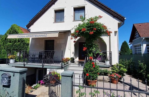 The holiday apartment is located in a single-family home built in 1991, was renovated in 2015 and is furnished in a modern style. Also due to the view over the lake from the property and its quiet location the domicile is popular. Available for shared use: sunbathing lawn, parasol, sun lounger, children's playground, swing, barbecue facilities, terrace, pavilion, garden furniture, campfire site and courtyard.LocationTihany. The holiday apartement is located on a 100 sqm enclosed garden plot with meadow, flowers, shrubs and trees, bordered by a fence. The landlord lives permanently in the house, but uses a seperate entrance. Access is via a side road (asphalted). Parking (for 1 car) is available on the street in front of the house. There is a charging station for electric cars in the village (350 m). Specialair conditioning, central heating (gas, wood & coal).Facilities: baby cot, internet access (WLAN), iron, ironing board and washing machine. TV reception takes place via electric wire. German, English. Italian, Dutch The accommodation has hypoallergenic pillows. Dogsallowed, EUR 4.00/pet per day. DistancesShopping 450 m, restaurant 300 m, town center 700 m. For a relaxing holiday, a car is not necessary. In summer: Balaton 500 m in Tihany (beach 500 m in Tihany featuring meadow). DivisionHoliday apartment, 1 floor, 3 rooms (including 2 bedrooms), 60 sqm, in total 4 beds, on request additionally 1 child up to 2 years in a baby cot. RoomThe entrance to your holiday apartment is located on the ground floor, is covered and leads over the 12 sqm terrace directly into the vestibule with wardrobe. Living room (60 sqm) with sitting area, TV and dining area (4 seats). All windows and external doors are secured with fly screens. Bedroom (12 sqm) with 1 double bed. All windows and external doors are secured with fly screens. Bedroom (12 sqm) with 1 double bed and 1 baby cot. All windows and external doors are secured with fly screens. American kitchen (25 sqm) with electric stove (ceramic hob, 2 plates), fridge (120 l), microwave, coffee machine, toaster and electric kettle. All windows and external doors are secured with fly screens. Bathroom (8 sqm, not heatable) with shower, 1 washbasin, WC, hairdryer and window. All windows and external doors are secured with fly screens. Terms of lease and pricesIncluded in the priceinternet access, air conditioning, parking place, electricity, water, heating, final cleaning, bed linen, hand towels, bathing towels, Wireless Internet access. Side costs-Costs on the spot:/Obligatory:local tax by local tariff.Deposit:EUR 100,-/object