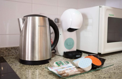 For your convenience, there's a refrigerator and a microwave. And because there's a washing machine, you can go a bit lighter on your packing.