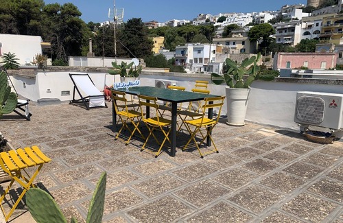 Casa Bernardo is a tastefully furnished, two-storey loft apartment with vaulted stone roofs, located in Castro Marina, a municipality in the province of Lecce. The flat has three double beds and can therefore accommodate up to six people. It has three bathrooms, two of which have showers, and two terraces, one on the lower floor and the other on the upper floor. It is equipped with air conditioning and radiators. On the lower floor there is a double bedroom with en-suite bathroom with shower, a dining area with table and chairs, a kitchen equipped with electric cooker and dishwasher, and a service bathroom. From the kitchen there is access to the outside terrace. On the upper floor are two double beds and a further bathroom with shower and another terrace. At guests' disposal are a fibre line with WiFi, a speaker with artificial intelligence, a washing machine and a barbecue.