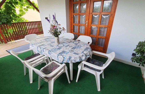 The holiday apartment is located in a single-family home and is furnished in a rustic style. The property is located on the outskirts. Also due to its quiet location the domicile is popular. Available for shared use: children's playground, swing, sandpit, barbecue facilities, pavilion, garden furniture and Hollywood swing. TrampolinLocationSiofok. The holiday apartement is located on a 800 sqm enclosed garden plot with meadow, flowers and trees, bordered by a fence. The landlord lives in the house, but uses a seperate entrance. The atmosphere of our summer residence makes it easy for you to forget your stressful weekdays and to recharge your batteries with us. A family-friendly and quiet environment with free WiFi, an outdoor playground where you can play table tennis, a pool, barbecue, gazebo and free parking in the yard. The caretaker lives in the building but uses a separate entrance.