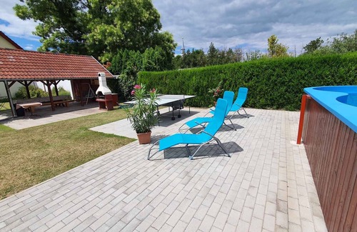 The holiday apartment is located in a single-family home and is furnished in a rustic style. Also due to its quiet location the domicile is popular. Available for shared use: children's playground, swing, sandpit, barbecue facilities, pavilion, garden furniture and Hollywood swing. TrampolinLocationSiofok. The holiday apartement is located on a 800 sqm garden plot with meadow. The landlord lives in the house, but uses a seperate entrance. The atmosphere of our summer residence makes it easy for you to forget your stressful weekdays and to recharge your batteries with us. A family-friendly and quiet environment with free WiFi, an outdoor playground where you can play table tennis, a pool, barbecue, gazebo and free parking in the yard. The caretaker lives in the house but uses a separate entrance.