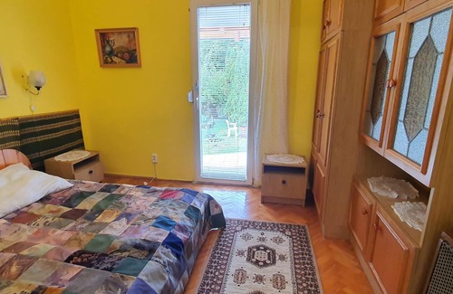 The holiday apartment is located in a detached house, built in 1980 and is in the typical country style furnished. The property is located in a holiday home area, in the center. The domicile is also popular because of the quiet and sunny location. For common use are available: sunbathing area, parasol, grill possibility, garden furniture and fire place.LocationZalakaros. The holiday apartement is located on a 400 sqm, closed garden plot with meadow, flowers, bushes and trees, limited by a fence. The landlord does not live in the house or on the property. The access goes via a side road (asphalted). Parking lot (for 3 cars) on the property. SpecialAir conditioning / heating: air conditioner. Facilities: internet access (WLAN). TV reception takes place via electric wire. Dogsnot allowed. DistancesShopping opportunity 400 m, restaurant 200 m, town center 200 m. thermal bath in Zalakaros 500 m.In summer: fishing in Galambok 5 km. Sármellék 25 km away. DivisionHoliday apartment, 1 floor, 5 rooms (including 4 bed rooms), 90 sqm, in total 8 beds. RoomThe entrance in your holiday apartment is located on the ground floor and leads over the 15 sqm terrace directly in the living room. Living room with sitting area, TV, dining area (6 seats) and access to the terrace (15 sqm, covered, garden furniture, 1 table, 6 chairs). 4 bedrooms each with 1 double bed. Kitchen with gas stove, oven, fridge (icebox), microwave, coffee machine, toaster and electric kettle. Bathroom with shower, 1 sink, WC and window. Separate toilet with WC and window. Terms of lease and pricesIncluded in the priceinternet access, parking place, electricity, water, final cleaning, bed linen, Wireless Internet access. Side costs-Costs on the spot:/Obligatory:local tax by local tariff.On request:air conditioning 5 € per object per day. For a fee: heating.Deposit:EUR 100,-/object
