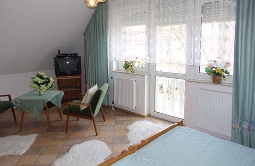 The holiday apartment is located in a detached house, built in 2000, renovated in 2017 and is rustic furnished. The property is located on the outskirts. The domicile is also popular because of the quiet and sunny location. For common use are available: parasol, grill possibility, garden furniture, hollywood swing and court.LocationHévíz. The holiday apartement is located on a 50 sqm, closed garden plot with meadow and bushes, limited by a fence. The landlord lives permanently in the house, but uses a seperate entrance. The access goes via a side road (asphalted). Parking lot (for 1 car) on the property and the street in front of the house. Specialair conditioner, central heating (gas). Facilities: internet access (WLAN) and iron. TV reception takes place via satellite. Programs in German and English can be reached. Dogsnot allowed. DistancesShopping opportunity 1 m, restaurant 5 m, town center 2 km. thermal bath in Hévíz 2 km.In summer: Bathing possibility 2 km in Hévíz. Hévíz: horse riding 3,5 km and tennis 4 km. Vineyard is only 100 m, small train Lilliput runs in front of the house, and takes you to the vineyard tour. You will find a number of wine cellars and restaurants on the mountain with a beautiful panorama of the surroundings. DivisionHoliday apartment, 1 floor, 1 rooms, 30 sqm, in total 2 beds. Smoking is prohibited in the property. RoomThe entrance in your holiday apartment is located on the 1st floor and leads over an internal staircase directly in the vestibule. Living/bedroom with 1 double bed and TV. Kitchen with dining area (2 seats), electric stove (1 plate), fridge (120 l), microwave, coffee machine, toaster and electric kettle. Bathroom with shower, 1 sink, WC, hairdryer and window. Terms of lease and pricesIncluded in the priceinternet access, air conditioning, parking place, electricity, gas, water, final cleaning, bed linen, Wireless Internet access. Side costs-Additionally(Payable when booking)/local tax.Deposit:No deposit.