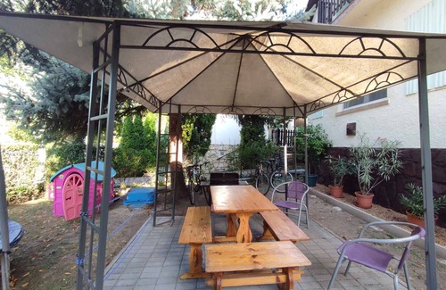 The holiday apartment is located in a single-family home, was renovated in 2021 and is furnished in a rustic style. The property is located on the outskirts. Also due to its quiet and sunny location the domicile is popular. Available for shared use: barbecue facilities, pavilion, garden furniture and Hollywood swing. Trampoline, children's bikeLocationSiofok. The holiday apartement is located on a 150 sqm enclosed garden plot with meadow, flowers, shrubs and trees, bordered by a fence. The landlord lives permanently in the house, but uses a seperate entrance. Other apartments in the same house. Access is via a side road (asphalted). Parking (for 1 car) is available on the property. Specialair conditioning.Facilities: children's toys and internet access (WLAN). TV reception takes place via electric wire.For your safety, the accommodation is equipped with smoke detector. Leisure2 bicycles. Dogsallowed, EUR 5.00/pet per day. DistancesShopping 300 m, restaurant 500 m, town center 3 km. In summer: Balaton 700 m in Siofok (beach 700 m in Siofok featuring meadow). DivisionHoliday apartment, 1 floor, 2 rooms (including 2 bedrooms), 62 sqm, in total 5 beds (including 1 additional bed). RoomThe entrance to your holiday apartment is located on the ground floor, is at ground level and leads over the 6 sqm terrace directly into the hallway. Kitchen with dining area (4 seats), gas stove (2 flames), oven, fridge (180 l, icebox), microwave, coffee machine and electric kettle. Bathroom with shower, 1 washbasin, WC and window. Bedroom with 2 single beds and TV. Bedroom with 2 single beds and 1 additional bed on sleeping accommodation. Terms of lease and pricesIncluded in the priceinternet access, air conditioning, parking place, electricity, gas, water, final cleaning, bed linen, Wireless Internet access. Side costs-Costs on the spot:/Obligatory:local tax by local tariff.Deposit:EUR 100,-/object