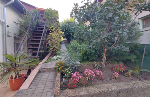 The holiday apartment is located in a single-family home, was renovated in 2021 and is furnished in a rustic style. The property is located on the outskirts. Also due to its quiet and sunny location the domicile is popular. Available for shared use: barbecue facilities, pavilion, garden furniture and Hollywood swing. Trampoline, children's bikeLocationSiofok. The holiday apartement is located on a 150 sqm enclosed garden plot with meadow, flowers, shrubs and trees, bordered by a fence. The landlord lives in the house, but uses a seperate entrance. Other apartments in the same house. Access is via a side road (asphalted). Parking (for 1 car) is available on the property. Specialair conditioning.Facilities: children's toys and internet access (WLAN). TV reception takes place via electric wire.For your safety, the accommodation is equipped with smoke detector. Leisure2 bicycles. Dogsallowed, EUR 5.00/pet per day. DistancesShopping 300 m, restaurant 500 m, town center 3 km. In summer: Balaton 700 m in Siofok (beach 700 m in Siofok featuring meadow). DivisionHoliday apartment, 1 floor, 2 rooms (including 2 bedrooms), 42 sqm, in total 4 beds. RoomThe entrance to your holiday apartment is located on the ground floor, is at ground level and leads over the 6 sqm terrace directly into the hallway. Kitchen with dining area (4 seats), gas stove (2 flames), oven, fridge (180 l, icebox), microwave, coffee machine and electric kettle. Bathroom with shower, 1 washbasin, WC and window. Bedroom with 1 double bed. Bedroom with 2 single beds. Terms of lease and pricesIncluded in the priceinternet access, air conditioning, parking place, electricity, gas, water, final cleaning, bed linen, Wireless Internet access. Side costs-Costs on the spot:/Obligatory:local tax by local tariff.Deposit:EUR 100,-/object