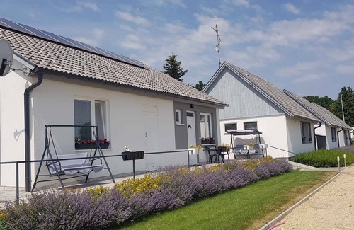 The holiday apartment built in 1990, was renovated in 2018 and is furnished in a modern and functional style. The property is located in a hotel complex, on the outskirts. Also due to the view over a panorama from the property and its quiet and sunny location the domicile is popular. Available for use: sunbathing lawn, sun lounger, barbecue facilities, terrace, garden furniture and Hollywood swing.Holiday resortinternet (WLAN). LocationBük, district Bükfürdő, 166 m above sea level. The holiday apartement is located in a hotel complex, on a 400 sqm enclosed garden plot with meadow, flowers, shrubs and trees, bordered by a fence. The guest house is bordered on two sides by farmland, it lies next to the main road and next to an empty plot in a quiet environment.Gabriella Panzió welcomes its guests with free WiFi, barbecue facilities, a terrace and free private parking in Bük, Vas county, just 27 km from Ligvándi Castle. Access is directly from the main road (asphalted). Parking (for 2 cars) is available on the property. SpecialFacilities: internet access (WLAN). TV reception takes place via satellite. WellnessIn the complex: sauna. Dogsallowed, EUR 12.00/pet per day. DistancesShopping 200 m (1000 m in winter), restaurant 45 m. thermal bath, indoor swimming pool each 300 m in Bük. After a day of hiking or cycling, you can relax in the garden or in the shared lounge. The Liszt Museum is 34 km away and the Eszterházy Palace is 35 km away. The nearest airport is Hévíz-Balaton Airport, 97 km away. DivisionHoliday apartment, 1 floor, 3 rooms (including 2 bedrooms), 50 sqm, in total 6 beds (including 2 additional beds). RoomThe entrance to your holiday apartment is located on the ground floor and leads over an external staircase.Ground floor: Bedroom (18 sqm) with 2 single beds. Cooking nook (5 sqm) with electric stove (ceramic hob, 4 plates), fridge (120 l, icebox), microwave, coffee machine, toaster and electric kettle. Bathroom with shower, 1 washbasin and WC. Ground floor (separate apartment): Living room with 2 additional beds on double sofa bed and TV. Bedroom with 1 double bed. Terms of lease and pricesIncluded in the pricesauna, internet access, baby cot (under 3 years), parking place, electricity, gas, water, final cleaning, bed linen, hand towels, sunloungers, Wireless Internet access. Side costs-Costs on the spot:/Obligatory:local tax by local tariff.Deposit:No deposit.