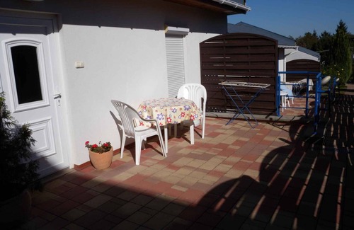 The holiday apartment built in 2008 and is furnished in a modern and functional style. The property is located in a holiday home area. Also due to its quiet and sunny location the domicile is popular. Available for use: parasol and garden furniture.LocationZalakaros. The holiday apartement is located on a 1000 sqm enclosed garden plot with meadow, flowers and shrubs, bordered by a fence. The landlord does not live in the house or on the property. Access is via a side road (asphalted). Parking (for 1 car) is available on the property. Specialair conditioning, central heating (gas). The apartments have individually adjustable central heatingFacilities: internet access (WLAN) and dryer. TV reception takes place via electric wire. Dogsnot allowed. DistancesShopping 50 m, restaurant 50 m. thermal bath in Zalakaros 200 m. In summer: Zalakaros 200 m in Zalakaros (beach 200 m in Zalakaros). fishing in Galambok 6 km. DivisionHoliday apartment, 1 floor, 2 rooms (including 1 bedroom), 40 sqm, in total 2 beds. RoomThe entrance to your holiday apartment leads over an external staircase and the 12 sqm terrace directly into the living room. Bedroom with 1 double bed. Living/bedroom with sitting area, TV, dining area (4 seats) and access to the terrace (garden furniture, 1 table, 2 chairs, parasol). American kitchen with dining area (2 seats), electric stove (2 plates), fridge (icebox), microwave, coffee machine, toaster, electric kettle, dryer and access to the terrace. Bathroom with shower, 1 washbasin, WC and window. Terms of lease and pricesIncluded in the priceinternet access, air conditioning, parking place, electricity, water, final cleaning, bed linen (first usage), Wireless Internet access. Side costs-Costs on the spot:/Obligatory:local tax by local tariff.Deposit:No deposit.