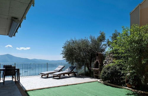 Outside, the garden is equipped with a brick barbecue, a relaxation table and two coordinated deck chairs with an electric sunshade that can cover the entire porch; inside in a shabby context the living room has a large fridge with freezer, built-in kitchen with induction cooker, oven, microwave, toaster, kettle and moka coffee, a sofa bed and a table with panoramic views from the large window; there is a washing machine. The master bedroom is well equipped with wardrobes and bedside tables and is characterized by the vivid blue of the wall behind the bed. In the bathroom the sanitary fixtures are suspended, the heating is by radiators. There is a large garage with lift to the floor.