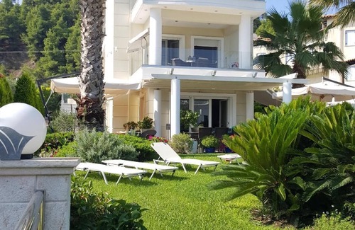 You are in a place where you can enjoy the sea breeze and the best Mediterranean climate. With private access to the beach, direct location to the crystal-clear bay with sunrises and sunsets, surrounded by idyllic countryside and several cycling and hiking trails. The ideal retreat from the hustle and bustle of modern life. Would you prefer to enjoy nature rather than water sports such as water skiing or windsurfing? You can still have a wonderful time in the area surrounding your accommodation, mountain biking, cycling tours, hiking, golf, mini golf, bowling, and so on. In general, you can see, hear, smell, taste and feel Greek culture in Halkidiki. When travelling around the peninsula, you can hardly get enough of the visual attractions that the natural landscape has to offer. Green pine forests alternate with golden flat sandy beaches, green meadows with olive and pistachio trees, steep coasts with extensive vineyards. You will be accompanied by the scent of herbs from the lush vegetation, birdsong and fresh, iodised sea air. For history buffs, there are also numerous museums, archaeological sites and artefacts to explore to familiarise you with ancient Greek culture. Take a trip to Kassandra, where the traditional market takes place, to Meteora, to the Pella theatre and open-air concert, to the ancient archaeological site of Olynthos or to the famous cave in Petralona. Also worth a visit is Athitos, a newly awakened traditional stone-built village with cobbled alleyways and marvellous panoramic spots and bathing bays. The town centre is approx. 700 m away on foot for shopping facilities.