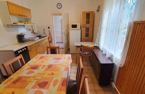 The holiday apartment built in 1897, was renovated in 2007 and is furnished in a rustic style. The property is located in a holiday home area, in the town centre. Also due to its quiet and sunny location the domicile is popular. Available for shared use: sunbathing lawn, parasol, sun lounger, terrace, garden furniture and campfire site.LocationBalatonföldvár. The holiday apartement is located on a 1800 sqm enclosed garden plot with meadow, flowers, shrubs and trees, bordered by a fence. The landlord lives permanently in the house, but uses a seperate entrance. The holiday apartment is located in a villa Access is via a side road (asphalted). Parking (for 3 cars) is available on the property. Specialoven in every room (gas).Facilities: baby cot and internet access (WLAN). Dogsnot allowed. DistancesShopping 150 m, restaurant 150 m, town center 150 m. railway station in Balatonföldvár 300 m. Marina 600 m. Bank 100 m. Pharmacy 50 m. Police 150m. In summer: Balaton 400 m in Balatonföldvár (beach 400 m in Balatonföldvár featuring meadow). Balatonföldvár: tennis 200 m and fishing 600 m. DivisionHoliday apartment, 1 floor, 2 rooms (including 2 bedrooms), 90 sqm, in total 8 beds. RoomThe entrance to your holiday apartment is located on the ground floor and leads over 5 steps and the 15 sqm terrace directly into the hallway with doors to all rooms. Kitchen with dining area (9 seats), gas stove, oven, fridge, microwave, coffee machine and toaster. Bathroom with shower and window. Separate toilet with WC and window. Bedroom with 1 double bed, 1 single bed and washroom. Bedroom with 1 double bed, 1 single bed, 2 additional beds and washroom. Terms of lease and pricesIncluded in the pricebabycot, internet access, parking place, electricity, gas, water, final cleaning, bed linen, sunloungers, baby cot – please order at booking, Wireless Internet access. Side costs-Costs on the spot:/Obligatory:local tax by local tariff.Deposit:EUR 100,-/object
