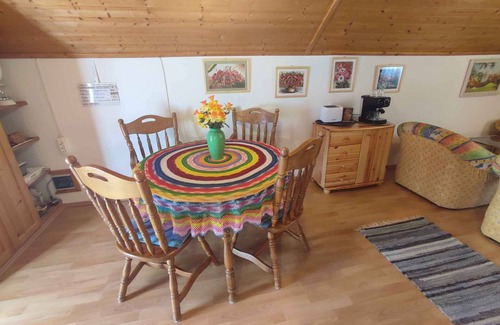 The holiday apartment is located in a single-family home, was renovated in 2001 and is furnished in a typical country style. The property is located in a residential area, on the outskirts. Also due to its quiet and sunny location the domicile is popular. Available for shared use: sunbathing lawn, parasol, sun lounger, barbecue facilities, garden furniture, Hollywood swing and campfire site.LocationBalatonfenyves. The holiday apartement is located on a 510 sqm enclosed garden plot with meadow, flowers and shrubs, bordered by a fence. The landlord lives permanently in the house, but uses a seperate entrance. On one side the estate is enclosed by a hedge. The other 3 sides are enclosed by a fence. Access is via a side road (asphalted). Parking (for 1 car) is available on the property. Specialair conditioning.Facilities: internet access (WLAN). TV reception takes place via satellite. Dogsallowed, EUR 3.00/pet per day. DistancesShopping 400 m (2,5 km in winter), restaurant 150 m, town center 1500 m. Balatonfenyves: doctor, pharmacy each 2 km. railway station, discotheque, bank each 2,5 km. thermal bath in Balatonszemes 10 km. Main road 200 m. Children's playground 1000 m. In summer: Balaton 400 m in Balatonfenyves (beach 500 m in Balatonfenyves). Balatonfenyves: boat rental 1000 m, horse riding, boat launch each 2,5 km. fishing, water sports each 400 m. DivisionHoliday apartment, 1 floor, 3 rooms (including 2 bedrooms), 56 sqm, in total 4 beds. RoomThe entrance to your holiday apartment is located upstairs and leads over the 25 sqm balcony directly into the kitchen-diner. Bedroom with 1 double bed and access to the balcony. Bedroom with 2 single beds. Eat-in kitchen with sitting area, TV, dining area (4 seats) and access to the balcony (garden furniture, 1 table, 4 chairs, 2 sunbeds, parasol). American kitchen with electric stove, oven, fridge (icebox), microwave and coffee machine. Bathroom with shower and 1 washbasin. Separate toilet with WC. Terms of lease and pricesIncluded in the priceinternet access, air conditioning, parking place, electricity, gas, water, final cleaning, bed linen, hand towels, Welcome drink, sunloungers, Wireless Internet access. Side costs-Costs on the spot:/Obligatory:local tax by local tariff.Deposit:EUR 100,-/object