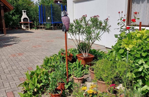 The holiday apartment is located in a single-family home built in 1988, was renovated in 2024 and is furnished in a modern style. The property is located in the town centre. Also due to its quiet and sunny location the domicile is popular. Available for shared use: barbecue facilities, pavilion and garden furniture. TrampolineLocationKeszthely. The holiday apartement is located on a 250 sqm enclosed garden plot with flowers and shrubs, bordered by a fence and a hedce. The landlord lives permanently in the house, but uses a seperate entrance. Access is via a side road (asphalted). Parking (for 4 cars) is available on the property. Electric gate with remote control. Specialcentral heating.Facilities: internet access (WLAN) and dryer. TV reception takes place via electric wire. Foreign language programmesFor your safety, the accommodation is equipped with CO2 detector, smoke detector and sockets with child safety lock. Dogsnot allowed. DistancesShopping 150 m, restaurant 300 m, town center 700 m. thermal bath, cinema each 5 km in Heviz. Keszthely: railway station 1200 m, indoor swimming pool, sauna each 1400 m. discotheque 2 km, pharmacy 400 m and doctor, bank each 700 m. airport in Sarmellek 15 km. Railway line 1200 m. In summer: Balaton 1400 m in Keszthely (beach 1400 m in Keszthely featuring meadow and sand). golf in Balatongyörök 9 km. Keszthely: fishing, water sports, boat rental, boat launch each 1400 m. horse riding 3 km and tennis 800 m. DivisionHoliday apartment, 1 floor, 4 rooms (including 3 bedrooms), 100 sqm, in total 6 beds. RoomEntrance via a spiral staircase. Living room (16 sqm) with sitting area, TV and dining area (6 seats). All windows and external doors are secured with fly screens. Bedroom (16 sqm) with 1 double bed and Füstérzékelő Honeywell R200S-2. Bedroom (15 sqm) with 1 double bed and Füstérzékelő Honeywell R200S-2. All windows and external doors are secured with fly screens. Kitchenette with gas stove (4 flames), oven, fridge (icebox), coffee machine, toaster, electric kettle and Szénmonoxid érzékelő Honeywell R200 CO. Anteroom (17 sqm). All windows and external doors are secured with fly screens. Bathroom with shower, 1 washbasin and WC. Bathroom with shower, 1 washbasin, WC and window. Bedroom (16 sqm) with 2 single beds. All windows and external doors are secured with fly screens. Terms of lease and pricesIncluded in the priceinternet access, parking place, electricity, gas, water, final cleaning, bed linen, Wireless Internet access. Side costs-Additionally(Payable when booking)/local tax.Costs on the spot:/On request:breakfast 8 € per person per day.Deposit:No deposit.