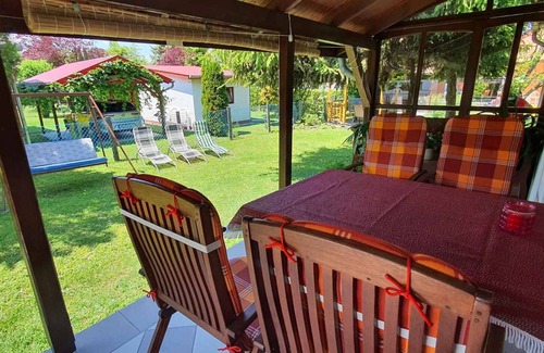 The holiday apartment is located in a single-family home built in 1977, was renovated in 2012 and is furnished in a typical country style. The property is located in a holiday home area, in the town centre. Also due to its quiet and sunny location the domicile is popular. Available for your exclusive use: sunbathing lawn, parasol, sun lounger, barbecue facilities, pavilion, garden furniture, Hollywood swing and campfire site.LocationBalatonfenyves. The holiday apartement is located on a 450 sqm enclosed garden plot with meadow, flowers, shrubs and trees, bordered by a fence. The landlord lives permanently in the house, but uses a seperate entrance. The accommodation is located in Balatonfenyves, 35 km from Thermal Lake Hévíz, 30 km from Festetics Castle and 39 km from Buffalo Reserve. This property offers access to a balcony and free private parking.