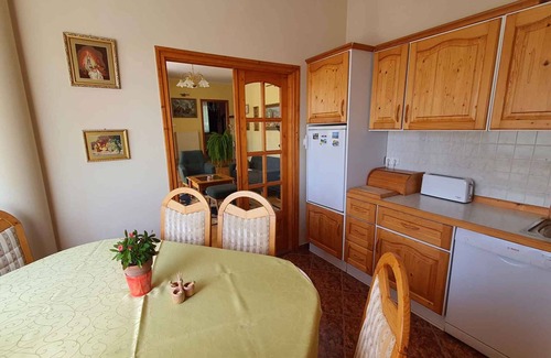 The holiday apartment is located in a single-family home built in 1998 and is furnished in a modern and typical country style. The property is located at the end of a cul-de-sac road, in a residential area. Also due to its quiet and sunny hillside location the domicile is popular. Available for shared use: sunbathing lawn, parasol, sun lounger, barbecue facilities and garden furniture. Washing machine is in the basementLocationFonyód. The holiday apartement is located on a 300 sqm enclosed garden plot with meadow, flowers, shrubs and trees, bordered by a fence. The landlord lives permanently in the house, but uses a seperate entrance. The holiday apartment BAL FON 025 (6 persons) is located on the upper floor Access is via a side road (asphalted). Parking (for 2 cars) is available on the property and on the street in front of the house. SpecialFacilities: internet access (WLAN) and washing machine. TV reception takes place via satellite. Dogsallowed, EUR 8.00/pet per day. DistancesShopping 250 m, restaurant 200 m, town center 900 m. In summer: Balaton 900 m in Fonyod (beach 900 m in Fonyod featuring meadow and sand). dog beach, fishing each 900 m in Fonyod. DivisionHoliday apartment, 1 floor, 3 rooms (including 2 bedrooms), 90 sqm, in total 4 beds. RoomThe entrance to your holiday apartment is located on the ground floor. Living room with sitting area, TV, access to the terrace (12 sqm, 1 table, 4 chairs) and tiled stove. Bedroom with 1 double bed. Bedroom with 2 single beds. Kitchen with dining area (6 seats), electric stove (ceramic hob), oven, extractor hood, dishwasher, fridge (icebox), microwave, coffee machine and toaster. Bathroom with bathtub with shower facility, shower, 1 washbasin, bidet and window. Separate toilet with WC and window. Terms of lease and pricesIncluded in the priceinternet access, parking place, electricity, gas, water, final cleaning, bed linen, sunloungers, Wireless Internet access. Side costs-Costs on the spot:/Obligatory:local tax by local tariff.On request:washing machine 5 € per stage of washing programme based on usage.Deposit:EUR 100,-/object