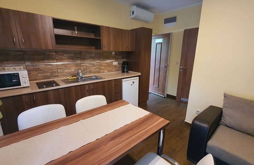 The holiday apartment built in 2014 and is furnished in a modern style. The property is located in a holiday home area, in the town centre. Also due to its quiet and sunny location the domicile is popular. Available for use: barbecue facilities and garden furniture.LocationSiofok. The holiday apartement is located on a 210 sqm enclosed garden plot with meadow, bordered by a fence. The landlord does not live in the house or on the property. The apartment BAL SIO 144 (4 people) is on the ground floor. Landlord accepts OTP Szép Kártya Parking (for 2 cars) is available on the property. Specialair conditioning.Facilities: high chair, internet access (WLAN) and safe. TV reception takes place via satellite. TV with USB connection. Dogsnot allowed. DistancesShopping 50 m, restaurant 10 m, town center 10 m. railway station in Szabadisóstó 800 m. Railway line 100 m. Siófok-Center 7 km. In summer: Balaton mit kostenpflichtiger Strand 120 m in Szabadisóstó. fishing in Szabadisóstó 1000 m. Free beach 800 m. DivisionHoliday apartment, 1 floor, 2 rooms (including 1 bedroom), 30 sqm, in total 4 beds. RoomThe entrance to your holiday apartment is located upstairs and leads over an external staircase directly into the kitchen-diner. Bedroom with 1 double bed. Living/bedroom with 2 additional beds on double sofa bed, sitting area, TV, dining area (4 seats) and access to the balcony (9 sqm, garden furniture, 1 table, 4 chairs). American kitchen with electric stove, fridge (icebox), microwave, coffee machine, toaster and electric kettle. Bathroom with shower, 1 washbasin, WC and window. Terms of lease and pricesIncluded in the priceinternet access, parking place, electricity, water, final cleaning, Welcome drink, bed linen (first usage), Wireless Internet access. Side costs-Costs on the spot:/Obligatory:local tax by local tariff.On request:air conditioning 35 € per object per week.Deposit:EUR 100,-/object