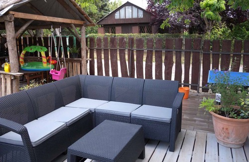 The holiday apartment built in 1980, was renovated in 2017 and is furnished in a modern style. The property is located in a holiday home area. Also due to its quiet and sunny location the domicile is popular. Available for shared use: sunbathing lawn, parasol, children's playground, swing, sandpit, barbecue facilities, pavilion, garden furniture, Hollywood swing, campfire site and courtyard. trampolineLocationSiofok. The holiday apartement is located on a 600 sqm enclosed garden plot with meadow and trees, bordered by a fence. The landlord does not live in the house or on the property. In the house there are still 3 apartments. Access is via a side road (asphalted). Parking is available on the street in front of the house. Specialair conditioning, central heating (gas).Facilities: internet access (WLAN), washing machine and dryer. TV reception takes place via satellite. Channels in different languagesFor your safety, the accommodation is equipped with smoke detector. PoolAll pools are available for shared use. Outdoor pool (usable from mid June to end of September, 3,1 m x 5,3 m, depth 1,2 m). Leisuretable tennis. Dogsallowed, EUR 15.00/pet per day. DistancesShopping 400 m, restaurant 400 m, town center 4 km. thermal bath, indoor swimming pool each 1500 m. In summer: Balaton 400 m. tennis in 1500 m. fishing in 400 m. horse riding in 5 km. DivisionHoliday apartment, 1 floor, 3 rooms (including 2 bedrooms), 60 sqm, in total 4 beds (including 2 additional beds). RoomThe entrance to your holiday apartment leads over 3 steps and the 6 sqm terrace directly into the vestibule. Bedroom (16 sqm) with 1 double bed. Bedroom (10 sqm) with 2 additional beds on double sofa bed and access to the terrace. Eat-in kitchen (24 sqm) with TV. Cooking nook in the kitchen-diner with dining area (4 seats), electric stove, fridge (icebox), microwave, coffee machine, toaster and electric kettle. Bathroom with shower, 1 washbasin, WC, window and Washing machine and tumble dryer in the staircase. Terms of lease and pricesIncluded in the priceOutdoor pool, internet access, air conditioning, parking place, laundry dryer, washing machine, electricity, gas, water, bed linen, pool, Wireless Internet access. Side costs-Costs on the spot:/Obligatory:final cleaning 25 € per object per stay. local tax by local tariff.Deposit:EUR 150,-/object