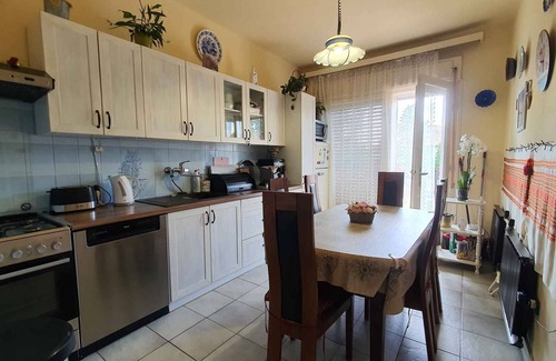 The holiday apartment is located in a single-family home built in 1980, was renovated in 2021 and is furnished in a typical country style. Also due to its sunny location the domicile is popular. Available for shared use: sunbathing lawn, parasol, sun lounger, garden shower, barbecue facilities, pavilion, garden furniture and Hollywood swing.Holiday resortAll bedrooms are protected by insects! LocationBalatonföldvár. The holiday apartement is located on a 800 sqm enclosed garden plot with meadow, flowers and shrubs, bordered by a fence and a hedce. The landlord lives in a separate building on the property. The house has BAL FOL 142 (lower apartment for 6 people) and BAL FOL 143 (upper apartment for 9 people). We are mainly looking for families with small children. Access is directly from the main road (asphalted). Parking is available on the property. SpecialFacilities: internet access (WLAN), iron, washing machine and dryer. TV reception takes place via electric wire. German-speaking and English broadcasts PoolAll pools are available for shared use. Outdoor pool (usable from mid May to end of September, diameter 4.5 m, depth 1.2 m). Dogsnot allowed. DistancesShopping 80 m, restaurant 500 m, town center 500 m. Balatonfoldvar: indoor swimming pool 1000 m, thermal bath 40 km, pharmacy, bank each 500 m. doctor 900 m. Children's playground 500 m. In summer: Balaton 400 m in Balatonfoldvar (beach 400 m in Balatonfoldvar featuring meadow). Balatonfoldvar: dog beach, tennis, fishing, boat launch each 1000 m. horse riding 3 km. DivisionHoliday apartment, 1 floor, 5 rooms (including 4 bedrooms), 140 sqm, in total 9 beds (including 3 additional beds). RoomThe entrance to your holiday apartment leads directly into the vestibule with doors to all rooms. Living room (20 sqm) with sitting area, TV and access to the balcony (garden furniture, 2 chairs). Bedroom (12 sqm) with 1 double bed and access to the loggia (garden furniture, 2 chairs). Bedroom (12 sqm) with 1 double bed. Bedroom (20 sqm) with 1 double bed. Bedroom (20 sqm) with 1 double bed, 1 single bed, TV and access to the loggia (garden furniture, 2 chairs). Kitchen (12 sqm) with dining area, gas stove, electric stove (4 plates), oven, extractor hood, dishwasher, fridge (icebox), microwave, coffee machine, toaster, electric kettle, washing machine, dryer and access to the balcony. Bathroom with washing machine, dryer, shower and 1 washbasin. Bathroom with bathtub with shower facility and 1 washbasin. 2 Separate toilet each with WC. Terms of lease and pricesSide costs-Costs on the spot:/Obligatory:local tax by local tariff.Deposit:EUR 150,-/object