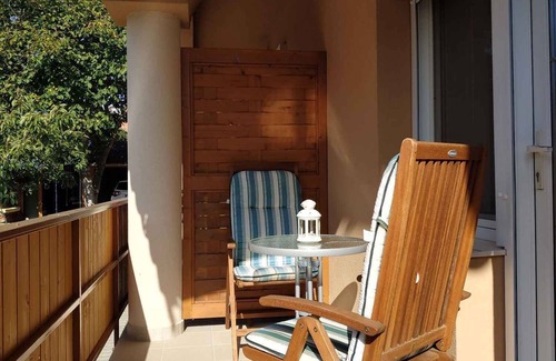 The apartment has a size of 45 square meters, a spacious bedroom, a living room, a dining room, a kitchen and a bathroom with shower and toilet. In the living room there is a wardrobe, a seating area, a TV and all rooms have doors. The apartment has its own south-facing balcony, which our guests particularly like. Chairs with adjustable backrests and cushions ensure comfort Living room (25 sqm) with sitting area, TV, dining area (4 seats) and access to the balcony (garden furniture, 1 table, 2 chairs, parasol). Bedroom (16 sqm) with 1 double bed and The bedroom has a comfortable double bed. The cozy bedroom has a 180×200 cm double bed with medical memory mattresses. The wardrobe and chest of drawers offer enough space for clothes even if you are staying for several weeks. Each apartment has a safe in the room. Additional services include blinds and mosquito nets. Kitchen in the kitchen-diner (10 sqm) with dining area (4 seats), electric stove (2 plates), extractor hood, fridge (icebox), microwave, coffee machine, toaster, electric kettle and access to the balcony. Bathroom (9 sqm) with with shower facility, shower, 1 washbasin, WC, hairdryer and window. Terms of lease and pricesIncluded in the priceinternet access, safe, electricity, water, final cleaning, attended parking lot, sunloungers, Bed linen (weekly change), cleaning (weekly), Blanket and pillow, Wireless Internet access. Side costs-Costs on the spot:/Obligatory:dish towels to bring along. hand towels to bring along. bathing towels to bring along. local tax by local tariff.On request:air conditioning 10 € per object per day. cleaning (daily) 15 € per object per day.Deposit:No deposit.