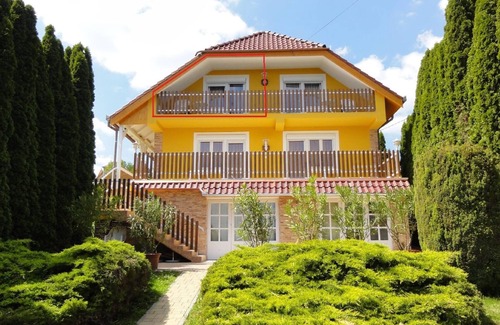 Your holiday property: Apartment house located in a quiet green area of the spa town of Zalakaros. This house is situated in a small park of 1500 square metres, only 550 metres from the spa and adventure pool. From all the flats you can enjoy a view of the enchanting surroundings, and in fine weather you can even see Lake Balaton. There are two secure car parks: one in front of and one behind the house. Behind the house there is a barbecue area with comfortable benches.