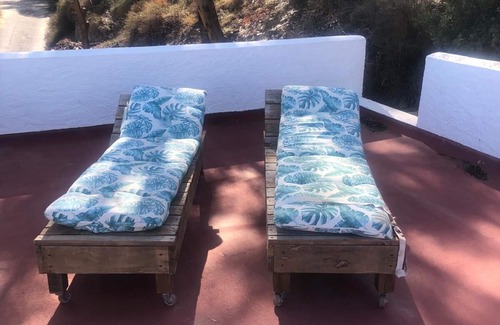 Completely self-contained ground floor holiday casita, forming part of a large old cortijo, set on a small private road with 4 houses. The house is set amongst pine and eucalyptus trees and has wonderful sea views from the large sunbathing terrace on the roof. Guests also have the use of a large barbecue area on the first floor of the property. It is within walking distance of Mojacar beach and a 5 minute drive from the historic Mojacar Pueblo dating back to the fifteenth century. Less than a five minute walk away is a small Carrefour supermarket and a very good Italian restaurant. Both the beach and the village offer lots of shops, restaurants and bars. The living area has a large sofa bed and there is a second bathroom off this room. There are French windows leading outside, a large double bedroom with ensuite bathroom and a small kitchenette, with large fridge/freezer, small oven, microwave, toaster, electric kettle etc. Guests are very welcome to have private use of the larger terrace, on the second floor. There is A/C in the fliving room and bedroom, and Wifi.