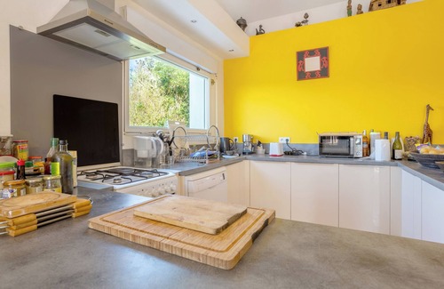 We offer you a spacious living room with four doors opening directly onto the terrace, a large dining table next to a large bay window offering a sea view, a ping-pong table for entertaining moments with friends in the heart of the living room, a relaxation area in front of the TV and the fireplace. A fully equipped kitchen, a bathroom with bathtub, and two bedrooms linked by a shared shower room. If you're bringing the kids, there's a large garden with a swing so they can play in complete freedom.
