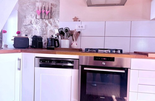 Located in Saint-Vincent-de-Mercuze at the foot of the Chartreuse mountains, this charming 78 sqm vacation home welcomes up to 6 guests. You will find 3 bedrooms with a queen size bed, double bed, and trundle bed offering 2 single beds, plus 1 bathroom with shower. The fully equipped private kitchen features a refrigerator with freezer, oven, gas stove, dishwasher, Nespresso machine, kettle, raclette machine, and complete small appliances. Air conditioning, Wi-Fi suitable for video calls, TV, washer, dryer, fan, and dedicated workspace ensure your comfort. Mountain views enhance your stay, and hygiene products including shower gel, shampoo, conditioner, and toothpaste are provided.
