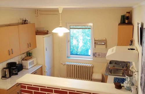 The holiday home built in 1991, was renovated in 2021 and is a semi-detached house and furnished in a typical country style. The property is located in a holiday home settlement. Also due to the view over the lake from the property and its quiet and sunny location the domicile is popular. Available for shared use: barbecue facilities and garden furniture.LocationGyenesdiás. The holiday home is located on a 500 sqm garden plot. The landlord lives in a separate building on the property. The other part of the house is the apartment part BALGYE071 with a separate entrance. Access is via a side road (asphalted). Parking (for 4 cars) is available on the property. SpecialFacilities: internet access (WLAN). TV reception takes place via electric wire.For your safety, the accommodation is equipped with smoke detector. Dogsnot allowed. DistancesShopping 500 m, restaurant 500 m, town center 500 m. Gyenesdiás: bank 1200 m, railway station 1500 m, indoor swimming pool, sauna, cinema each 2 km. doctor, pharmacy each 600 m. thermal bath in Hévíz 8 km. discotheque in Vonyarcvashegy 4 km. Children's playground 600 m. In summer: Balaton 1,8 km in Gyenesdiás (beach 1,8 km in Gyenesdiás featuring meadow and sand). Gyenesdiás: tennis, golf, fishing, water sports, boat rental, boat launch each 1,8 km. horse riding 800 m. dog beach in Keszthely 2,5 km. DivisionHoliday home, 1 floor, 4 rooms (including 3 bedrooms), 80 sqm, in total 5 beds. RoomThe entrance to your holiday home is located on the ground floor and leads over an internal staircase directly into the vestibule.Ground floor: Bedroom with 1 single bed. Kitchen with dining area (4 seats), gas stove (4 flames), oven, fridge (icebox), microwave, coffee machine and toaster. Bathroom with shower, 1 washbasin and WC. Top floor: Bedroom with 2 single beds. Bedroom with 1 double bed. Living room with sitting area and TV. Terms of lease and pricesIncluded in the priceparking place, electricity, gas, water, final cleaning, bed linen, hand towels, Wireless Internet access. Side costs-Additionally(Payable when booking)/local tax.Deposit:EUR 100,-/object