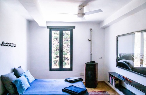 La Bermeja is located on the edge of a small white Andalusian farming village just 15 minutes north of Malaga and overlooks a mountainous landscape of olive, almond and wheat fields. Hiding behind a typical village facade is the spacious, open plan, contemporary 2-storey apartment topped with an expansive terrace with magnificent views of the surrounding countryside and a bbq. The property consists of a living room, a well-equipped kitchen, 1 bedroom and 1 bathroom and can therefore accommodate 2 people. Additional amenities include Wi-Fi with a dedicated workspace for home office, ceiling fans in the living room and in the bedroom, a fireplace, a washing machine as well as a TV. Large windows in the lounge, kitchen and bedroom take in the view of an ancient olive grove planted on a rocky hillside. Recently restored by the owner (an artist), it is decorated & furnished with much of his and other artists' work. The house has air-conditioning (inverter for winter), fire place and ceiling fans.