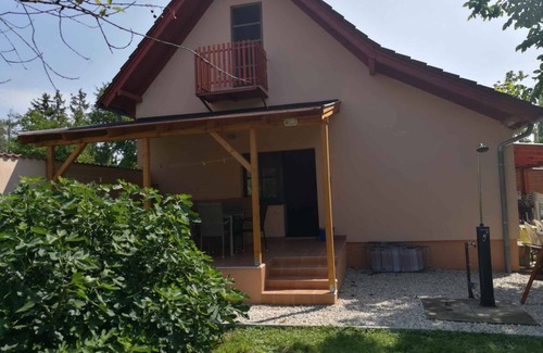 The holiday home built in 1979, was renovated in 2017 and is a semi-detached house and furnished in a functional style. The property is located in a holiday home settlement. Also due to its quiet and sunny location the domicile is popular. Available for use: sunbathing lawn, sun lounger, garden shower, barbecue facilities, terrace, garden furniture, Hollywood swing, campfire site and courtyard.LocationGyenesdiás. The holiday home is located on a 350 sqm enclosed garden plot with meadow, flowers, shrubs and trees, bordered by a fence. The landlord lives only occasionally in the house, but uses a seperate entrance. Access is via a side road. Parking (for 2 cars) is available on the property and on the street in front of the house. Specialair conditioning. There is no heating.Facilities: internet access (WLAN). TV reception takes place via electric wire. WellnessSauna. Leisuretable tennis and darts. Dogsnot allowed. DistancesShopping 200 m, restaurant 200 m, town center 200 m. doctor, pharmacy, bank each 500 m in Gyenesdiás. Railway line 300 m. Main road 100 m. Children's playground 400 m. In summer: Balaton 600 m in Gyenesdiás (beach 600 m in Gyenesdiás featuring meadow and gravel). golf in Balatongyörök 5 km. Gyenesdiás: mini golf 400 m, tennis 500 m and horse riding, fishing, boat rental each 800 m. boat launch in Keszthely 4 km. water sports in Vonyarcvashegy 2 km. DivisionHoliday home, 1 floor, 2 rooms (including 1 bedroom), 42 sqm, in total 6 beds (including 2 additional beds). RoomThe entrance to your holiday home leads over the terrace directly into the living & bedroom with sitting area.Ground floor: Living room (20 sqm) with 1 bunk bed, sitting area, TV, (6 seats) and access to the terrace (covered, garden furniture, 1 table, 6 chairs, 2 sunbeds, Hollywood swing). All windows and external doors are secured with fly screens. Kitchen (6 sqm) with dining area (6 seats), electric stove (ceramic hob, 2 plates), dishwasher, fridge (120 l, icebox), microwave, coffee machine, toaster, electric kettle and access to the terrace. All windows and external doors are secured with fly screens. Bathroom (3 sqm, not heatable) with with shower facility, shower, 1 washbasin, WC and window. All windows and external doors are secured with fly screens. 1st floor: Bedroom (12 sqm) with 1 double bed, 2 single beds and access to the loggia. All windows and external doors are secured with fly screens. Terms of lease and pricesIncluded in the priceair conditioning, parking place, electricity, water, final cleaning, bed linen, table tennis, darts, sunloungers, Wireless Internet access. Side costs-Costs on the spot:/Obligatory:local tax by local tariff.On request:sauna 10 € all inclusive per time of usage. heating material (wood/coal) 100 € per cubic meter based on usage (17.05.25-04.10.25, 16.05.26-03.10.26).Deposit:EUR 100,-/object