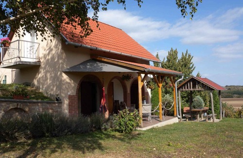 The detached holiday home was renovated in 2016 and is furnished in a rustic style. The property is located on the outskirts. Also due to the view over woods from the property and its quiet and sunny location the domicile is popular. Available for your exclusive use: parasol, sun lounger, barbecue facilities, terrace, pavilion, garden furniture, campfire site and courtyard.LocationBalatonendred. The holiday home is located on a open garden plot with meadow, flowers, shrubs and trees. The landlord does not live in the house or on the property. Access is directly from the main road (asphalted). Parking (for 2 cars) is available on the property. Specialair conditioning. There is no heating.Facilities: internet access (WLAN). TV reception takes place via satellite. Dogsnot allowed. DistancesShopping 500 m, restaurant 4 km, town center 1000 m. railway station in Zamárdi 4 km. In summer: Balaton 5 km in Zamárdi (beach 5 km in Zamárdi featuring meadow). fishing in Balatonendred 1200 m. Soccer field, fishing pond and game park in Balatonendréd DivisionHoliday home, 2 floors, 3 rooms (including 2 bedrooms), 50 sqm, in total 5 beds (including 1 additional bed). RoomThe entrance to your holiday home is located on the ground floor, is at ground level and leads over the 18 sqm terrace directly into the living & bedroom.Ground floor: Living/bedroom with 1 additional bed on sleeping accommodation, sitting area and TV. Kitchen with dining area (5 seats), gas stove (3 flames), fridge (icebox), microwave and coffee machine. Bathroom with shower, 1 washbasin and WC. Upper floor: 2 bedrooms each with 2 single beds. Terms of lease and pricesIncluded in the priceinternet access, air conditioning, parking place, electricity, water, final cleaning, sunloungers, bed linen (first usage), Wireless Internet access. Side costs-Costs on the spot:/Obligatory:local tax by local tariff.Deposit:EUR 150,-/object