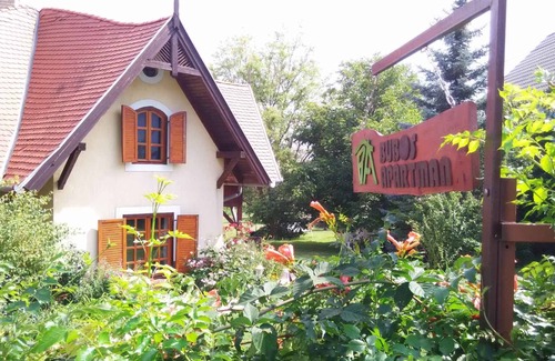 The detached holiday home built in 1998, was renovated in 2021 and is furnished in a rustic and typical country style. The property is located in a residential area. Also due to the view over the lake from the property and its quiet and sunny location the domicile is popular. Available for your exclusive use: sunbathing lawn, parasol, sun lounger, barbecue facilities, terrace, garden furniture, Hollywood swing, campfire site and courtyard.LocationSzentantalfa. The holiday home is located on a 1700 sqm enclosed garden plot with meadow, flowers and shrubs, bordered by a fence and a hedce. The landlord does not live in the house or on the property. It is right next to a nature reserve. The village is bordered by wooded hills and vineyards to the east and west. If we look south from the balcony of the house, we can see Lake Balaton. Access is via a side road (asphalted, length 300 m). Parking (for 4 cars) is available on the property and on the street in front of the house. Specialair conditioning, electric heating.Facilities: children's toys, internet access (WLAN), iron, ironing board and washing machine. TV reception takes place via electric wire. 117 canals, Hungarian and foreign taxesFor your safety, the accommodation is equipped with smoke detector. Leisure2 bicycles, table football and darts. Dogsallowed, EUR 10.00/pet per day. DistancesShopping 400 m (400 m in winter), restaurant 400 m, town center 400 m. indoor swimming pool, sauna each 17 km in Balatonfüred. thermal bath in Héviz 40 km. discotheque in Révfülöp 10 km. airport in Sármellék 45 km. railway station, cinema, doctor, pharmacy, bank each 5 km in Zánka. Railway line 5 km. Main road 300 m. Children's playground 150 m. In summer: Balaton 5 km in Zánka (beach 5 km in Zánka featuring meadow). Balatonfüred: mini golf 16 km and tennis 17 km. golf in Balatonudvari 9,7 km. boat launch in Révfülöp 16 km. dog beach in Sajkod 16 km. horse riding in Tagon 1000 m. fishing, water sports, boat rental each 5 km in Zánka. DivisionHoliday home, 2 floors, 3 rooms (including 2 bedrooms), 85 sqm, in total 6 beds (including 2 additional beds), on request additionally 1 child up to 2 years in a baby cot. RoomThe entrance to your holiday home is located on the ground floor, is covered and at ground level and leads over the 5 sqm terrace directly into the living room.Souterrain: Cellar (26 sqm) with sitting area and darts, csocso. Ground floor: Living room (35 sqm) with sitting area, TV, radio, CD player, dining area (8 seats) and access to the terrace (8 sqm, covered, garden furniture, 1 table, 2 chairs). Cooking nook in the living room (7 sqm) with electric stove (ceramic hob, 4 plates), oven, fridge (140 l, icebox), microwave, coffee machine, toaster and electric kettle. Storeroom (2 sqm, not heatable) with elelmiszer polc