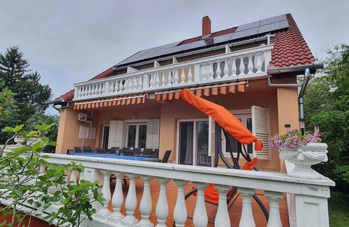 The standig individually holiday home, renovated in 2020 is modern furnished. The property is located in a busy environment, in a holiday home area. The domicile is also popular because of the sunny location. For exclusive use are available: sunbathing area, grill possibility, terrace, pavilion, garden furniture, hollywood swing and court.LocationFonyód. The holiday home is located on a 600 sqm, closed garden plot with meadow, flowers and trees, limited by a fence. The landlord does not live in the house or on the property. The access goes via a side road (asphalted). Parking lot (for 2 cars) on the property. Specialair conditioner, central heating (gas). Facilities: cot, high chair, internet access (WLAN), iron and washing machine. TV reception takes place via satellite. Programs in German and English. Dogsnot allowed. DistancesShopping opportunity 300 m, restaurant 2 km, town center 4,5 km. thermal bath in Csisztapuszta 5,6 km. railway station, pharmacy, bank each 4,5 km in Fonyód. Children's playground 300 m.In summer: Balaton mit Strand 300 m in Fonyód (beach 300 m in Fonyód with meadow). Fonyód: fishing 300 m and boat rental, boat launch each 4,5 km. DivisionHoliday home, 2 floors, 5 rooms (including 4 bed rooms), 270 sqm, in total 12 beds (including 8 additional beds). Smoking is prohibited in the property. RoomThe entrance in your holiday home is located on the ground floor and leads over 6 stages directly in the vestibule.Ground floor: Living room with 2 extra beds on double sofa bed, sitting area, TV, radio and air conditioner. Bedroom with 2 extra beds on double sofa bed, access to the terrace and air conditioner. Kitchen with dining area (6 seats), gas stove (4 flames), oven, fridge (120 l, icebox), microwave, coffee machine and toaster. Bathroom with shower, 1 sink, WC and window. Upper floor: Bedroom with 2 extra beds on double sofa bed and air conditioner. Bedroom with 1 double bed, 2 extra beds on double sofa bed, access to the balcony and air conditioner. Bedroom with 1 double bed, 1 crib, access to the balcony and air conditioner. Bathroom with bathtub with shower facility, washing machine, 1 sink and window. Separate toilet with 1 sink and WC. Terms of lease and pricesIncluded in the pricebabycot, internet access, baby cot, air conditioning, parking place, electricity, gas, water, final cleaning, bed linen, hand towels, Wireless Internet access. Side costs-Costs on the spot:/Obligatory:local tax by local tariff.On request:Bed linen (weekly change) 7 € per person per change.Deposit:EUR 400,-/object.