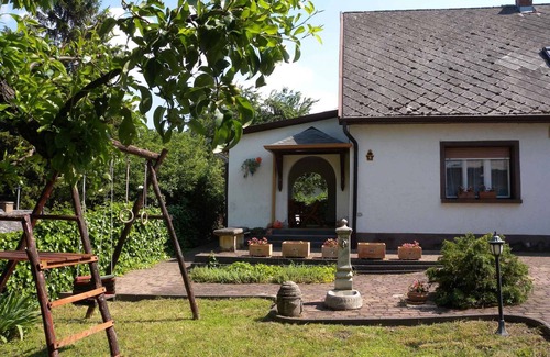 The detached holiday home was renovated in 1998 and is furnished in a rustic style. The property is located in a holiday home settlement, on the outskirts. Also due to its quiet and sunny location the domicile is popular. Available for your exclusive use: sunbathing lawn, sun lounger, children's playground, swing, barbecue facilities, terrace, garden furniture and campfire site.LocationSiofok. The holiday home is located on a 600 sqm enclosed garden plot with meadow, flowers, shrubs and trees, bordered by a fence. The landlord does not live in the house or on the property. Access is via a side road (asphalted). Parking (for 3 cars) is available on the property. Specialcentral heating (gas). with fireplace in the living roomFacilities: children's toys, internet access (WLAN) and iron. TV reception takes place via antenna. TV channels only in local language.For your safety, the accommodation is equipped with smoke detector. Leisuredarts. Dogsnot allowed. DistancesShopping 200 m, restaurant 200 m, town center 4 km. cinema, doctor, bank each 4 km. airport in Budapest Liszt Ferenc repüloter 10 km. Siofok Szabadifürdo: thermal bath, indoor swimming pool, sauna each 200 m. railway station, discotheque, pharmacy each 500 m. Railway line 200 m. Main road 200 m. Children's playground 500 m. Center Siófok-Szabadifürdő 300 m. Center Siófok 3 km. In summer: Balaton 300 m in Siofok Szabadifürdo (beach 300 m in Siofok Szabadifürdo featuring meadow and bathing plateaus). diving, boat launch each 4 km. Siofok Szabadifürdo: mini golf 200 m, tennis 250 m, golf, fishing each 300 m. dog beach, water sports, boat rental each 500 m. horse riding in Szantod 15 km. Waterslide 300 m. Galerius adventure 500 m. DivisionHoliday home, 1 floor, 3 rooms (including 2 bedrooms), 80 sqm, in total 6 beds (including 2 additional beds). RoomThe entrance to your holiday home is located on the ground floor, is covered and at ground level and leads over the terrace directly into the kitchen-diner with doors to all rooms. Bedroom with 1 double bed. Bedroom with 2 single beds. Living/bedroom with 2 additional beds on double sofa bed, sitting area, TV, fireplace, dining area (4 seats), access to the terrace (18 sqm, covered, garden furniture, 1 table, 6 chairs, 1 sun lounger) and Smart TV. Kitchenette with gas stove (4 flames), oven, fridge (icebox), microwave, coffee machine, toaster and Tumble dryer, cleaning tools. Bathroom with bathtub with shower facility, 1 washbasin and hairdryer. Separate toilet with WC. Terms of lease and pricesIncluded in the priceparking place, electricity, gas, water, final cleaning, bed linen, Welcome drink, sunloungers, Wireless Internet access. Side costs-Costs on the spot:/Obligatory:local tax by local tariff.Deposit:EUR 150,-/object
