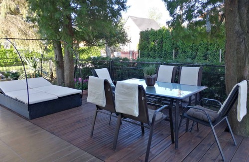 The detached holiday home built in 1989, was renovated in 2020 and is furnished in a modern and functional style. The property is located in a holiday home settlement, in the town centre. Also due to its quiet and sunny location the domicile is popular. Available for use: sunbathing lawn, parasol, sun lounger, children's playground, sandpit, barbecue facilities, terrace, garden furniture, campfire site and courtyard. Children's games, badminton and other outdoor games!LocationBalatonmáriafürdő. The holiday home is located on a 367 sqm enclosed garden plot with meadow, flowers, shrubs and trees, bordered by a fence and a hedce. The property is located in the center of the settlement, in a quiet environment! Access is via a side road (asphalted). Parking (for 1 car) is available in a carport and on the street in front of the house. There is an additional free parking in front of the house on the street Specialair conditioning, central heating (gas), electric heating. Convection gas stove + infrared panel + cooling-heating-air conditioning!Facilities: children's toys, internet access (WLAN), iron, washing machine and dryer. TV reception takes place via antenna. TV channels only in local language. NetfixFor your safety, the accommodation is equipped with CO2 detector, smoke detector and fire extinguisher. PoolAll pools are available for exclusive use. Outdoor pool (usable from mid June to mid September, diameter 3.6 m, depth 0.9 m). Leisure2 bicycles. Dogsnot allowed. DistancesShopping 200 m, restaurant 200 m, town center 200 m. Balatonmáriafürdő: bank 100 m, discotheque 200 m, railway station, doctor each 300 m. pharmacy 600 m. thermal bath in Héviz 22 km. cinema in Hévíz 22 km. indoor swimming pool, sauna each 13 km in Marcali. airport in Sármellék 15 km. Railway line 300 m. Main road 200 m. Children's playground 200 m. In summer: Balaton 300 m in Balatonmáriafürdő (beach 250 m in Balatonmáriafürdő featuring meadow). horse riding in Balatonkeresztúr 2 km. Balatonmáriafürdő: tennis, fishing each 300 m. water sports, boat launch each 800 m. golf in Batalongyörök 25 km. dog beach in Fonyód 15 km. DivisionHoliday home, 1 floor, 4 rooms (including 3 bedrooms), 110 sqm, in total 7 beds (including 1 additional bed). RoomThe entrance to your holiday home is located on the ground floor and leads over 2 steps and the 25 sqm terrace directly into the vestibule with doors to all rooms. The property has two entrances, both accessed via a patio, one patio is approximately 4m2 and the other 25m2! Step one! There are two entrances, one of which leads to the living room!Ground floor: Living room (17 sqm, walk-through room, not heatable) with sitting area, TV, fireplace, DVD player, CD player, dining area (6 seats) and access to the terrace (30 sqm, garden furniture, 1 table, 6 chairs, 2 sunbeds, parasol). All windows and external doors are secured with fly screens. Bedroom (8 sqm, not heatable) with 1 double bed. All windows and external doors are secured with fly screens. Kitchenette (6 sqm, walk-through room) with (1 flame), electric stove (ceramic hob, 4 plates), oven, extractor hood, dishwasher, fridge (180 l, icebox), microwave, coffee machine, toaster, electric kettle and access to the terrace. All windows and external doors are secured with fly screens. Bathroom (4 sqm, not heatable) with washing machine, shower, 1 washbasin, hairdryer, 2 bathrobes and window. All windows and external doors are secured with fly screens. Separate toilet with washing machine, WC and window. Upper floor: Bedroom (12 sqm, not heatable) with 2 single beds, TV, video and access to the balcony. All windows and external doors are secured with fly screens. Bedroom (17 sqm, not heatable) with 1 double bed, 1 single bed, TV, DVD player and access to the balcony. All windows and external doors are secured with fly screens. Bathroom (3 sqm, not heatable) with bathtub, 1 washbasin, 4 bathrobes and window. All windows and external doors are secured with fly screens. Separate toilet with WC. Terms of lease and pricesIncluded in the priceOutdoor pool, bicycle, air conditioning, parking place, washing machine, electricity, gas, water, final cleaning, bed linen, hand towels, pool, sunloungers, Wireless Internet access. Side costs-Costs on the spot:/Obligatory:local tax by local tariff.Deposit:EUR 200,-/object.