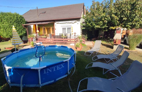 The detached holiday home was renovated in 2023 and is furnished in a modern and rustic style. The property is located on the outskirts. Also due to its quiet and sunny location the domicile is popular. Available for your exclusive use: parasol, sun lounger, barbecue facilities, terrace, garden furniture, Hollywood swing and courtyard. The landlord has an old, friendly dog that is locked in the back of the property.LocationSiofok. The holiday home is located on a 300 sqm enclosed garden plot with meadow, flowers, shrubs and trees, bordered by a fence. The landlord does not live in the house or on the property. Access is via a side road (asphalted). Parking (for 3 cars) is available on the property and on the street in front of the house. Specialair conditioning, oven in every room (gas).Facilities: internet access (WLAN). TV reception takes place via electric wire.For your safety, the accommodation is equipped with smoke detector. PoolAll pools are available for exclusive use. Outdoor pool (usable from early June to end of August, diameter 3 m, depth 0,8 m). Dogsallowed, EUR 5.00/pet per day. DistancesShopping 300 m, restaurant 600 m, town center 3 km. In summer: Balaton 800 m in Siofok (beach 800 m in Siofok featuring meadow). DivisionHoliday home, 1 floor, 4 rooms (including 3 bedrooms), 100 sqm, in total 7 beds (including 1 additional bed). RoomThe entrance to your holiday home is located on the ground floor and leads over the 20 sqm terrace directly into the living room with sitting area. Living room with sitting area, TV and access to the terrace. Bedroom with 1 double bed. Bedroom with 1 double bed, 1 additional bed on sleeping accommodation and TV. Kitchen with dining area (6 seats), gas stove (4 flames), oven, extractor hood, fridge (180 l, icebox), microwave, coffee machine and electric kettle. Bathroom with shower, 1 washbasin and window. Separate toilet with 1 washbasin, WC and window. Bedroom with 1 double bed and TV. Terms of lease and pricesIncluded in the priceOutdoor pool, internet access, air conditioning, parking place, electricity, gas, water, final cleaning, bed linen, pool, Wireless Internet access. Side costs-Costs on the spot:/Obligatory:local tax by local tariff.Deposit:EUR 150,-/object