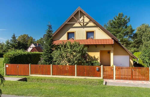 The detached holiday home built in 2008 and is furnished in a modern and functional style. The property is located in a holiday home settlement, on the outskirts. Also due to its quiet and sunny location the domicile is popular. Available for your exclusive use: sunbathing lawn, parasol, sun lounger, barbecue facilities, terrace and garden furniture. basketball backboardLocationBalatonkeresztúr. The holiday home is located on a 700 sqm enclosed garden plot with meadow, flowers, shrubs and trees, bordered by a fence and a hedce. The landlord does not live in the house or on the property. Access is via a side road (asphalted). Parking is available on the property and on the street in front of the house. Specialair conditioning. Air conditioning for an extra charge.Facilities: washing machine and dryer. TV reception takes place via satellite. PoolAll pools are available for exclusive use. Outdoor pool (usable from early May to end of September, diameter 2,6 m, depth 0,7 m). Dogsnot allowed. DistancesShopping 800 m, restaurant 150 m. In summer: Balaton 800 m in Balatonkeresztúr (beach 800 m in Balatonkeresztúr featuring meadow). DivisionHoliday home, 2 floors, 4 rooms (including 3 bedrooms), 125 sqm, in total 6 beds. RoomThe entrance to your holiday home is located on the ground floor, is at ground level and leads directly into the vestibule.Ground floor: Living room (walk-through room) with sitting area, TV, dining area (6 seats) and access to the terrace (covered, garden furniture, 1 table, 4 chairs, 4 sunbeds). Bathroom with shower, 1 washbasin and WC. 1st floor: Bedroom with 1 double bed. Bedroom with 1 additional bed on double sofa bed and TV. Bedroom with 2 single beds. Bathroom with washing machine, shower, 1 washbasin and WC. Kitchen with electric stove, oven, fridge, microwave, coffee machine and electric kettle. Terms of lease and pricesIncluded in the priceOutdoor pool, parking place, electricity, gas, water, bed linen, pool, sunloungers. Side costs-Costs on the spot:/Obligatory:final cleaning 35 € per object per stay. hand towels to bring along. local tax by local tariff.On request:air conditioning 5 € per room per day.Deposit:EUR 200,-/object.