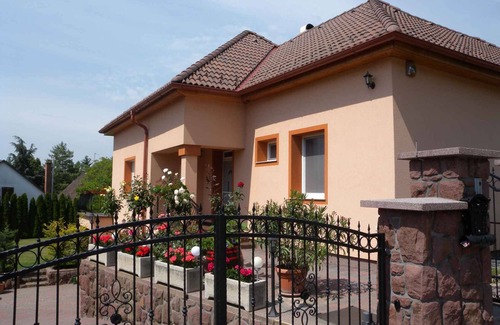 The detached holiday home built in 2014 and is furnished in a modern style. The property is located in a residential area. Also due to its quiet and sunny location the domicile is popular. Available for your exclusive use: sunbathing lawn, parasol, sun lounger, children's playground, swing, garden shower, barbecue facilities, terrace, pavilion, garden furniture, Hollywood swing, campfire site, dog kennel and courtyard.LocationBalatonfűzfő. The holiday home is located on a 860 sqm enclosed garden plot with meadow, flowers, shrubs and trees, bordered by a fence. The landlord does not live in the house or on the property. Access is via a side road (asphalted). Parking (for 3 cars) is available on the property. Automatic doors and automatic garage door approach. Specialair conditioning, central heating (gas, wood & coal), underfloor heating.Facilities: baby cot, high chair, internet access (WLAN), iron, washing machine and dryer. TV reception takes place via electric wire. German channels are available. PoolAll pools are available for exclusive use. Outdoor pool (usable from mid April to mid October, heatable, 3 m x 6 m, depth 1.5 m). Sliding pool roof. The pool is bright so you can use it at night. The water temperature is 28-34 degrees Celsius. The pool can be heated and cooled. Wellnesswhirlpool. Leisuretable tennis, table football and darts. Dogsallowed, EUR 10.00/pet per day. DistancesShopping 700 m, restaurant 200 m, town center 700 m. pharmacy in Balaton Gyógyszertár 2 km. indoor swimming pool in Balaton uszoda 2 km. railway station in Buszpályaudvar 3,5 km. doctor in Dézsi Csaba Zoltán 350 m. bank in OTP Bank 5 km. Railway line 500 m. Main road 250 m. Children's playground 300 m. Summer toboggan run and adventure park 2km. In summer: Balaton (beach 700 m in Föveny fürdő featuring meadow, sand and bathing plateaus). tennis in angyal jozsef 2 km. fishing in Balaton 700 m. DivisionHoliday home, 1 floor, 3 rooms (including 2 bedrooms), 160 sqm, in total 6 beds, on request additionally 1 child up to 2 years in a baby cot. RoomThe entrance to your holiday home is covered and at ground level and leads directly into the vestibule. 2 bedrooms each with 1 double bed. Living/bedroom with 2 additional beds on double sofa bed, sitting area, TV, fireplace, DVD player and access to the terrace (20 sqm, garden furniture, 1 table, 6 chairs). American kitchen with dining area (6 seats), electric stove (ceramic hob), oven, extractor hood, dishwasher, fridge (icebox), microwave, coffee machine, toaster and electric kettle. Bathroom with bathtub with shower facility, shower, 1 washbasin, WC, bidet, hairdryer and window. Separate toilet with washing machine, 1 washbasin, WC and window. Terms of lease and pricesIncluded in the priceOutdoor pool, babycot, internet access, air conditioning, parking place, whirlpool, electricity, water, final cleaning, bed linen, pool, sunloungers, baby cot – please order at booking, high chair - please order at booking, Wireless Internet access. Side costs-Costs on the spot:/Obligatory:local tax by local tariff.Deposit:EUR 150,-/object