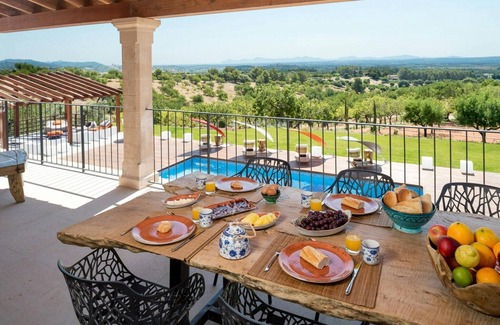 Stylish and inviting holiday home located in Moscari, this exquisite property features five en-suite bedrooms, comfortably accommodating up to 10 guests. The villa boasts air conditioning throughout, a spacious living area, and unique art pieces that enhance its modern elegance. Guests can enjoy the serene surroundings with access to a heated saltwater pool, a shared tennis court, and a games room equipped with a billiard table and projector screen. A concierge service is also available for additional luxuries, ensuring a tailored experience during your stay. Set on a sprawling 30-hectare estate, the villa offers a peaceful retreat while being conveniently located just 30 minutes from Palma and the northern beaches of Mallorca. Guests can explore nearby olive and almond groves or partake in activities like tennis, cycling, and guided mountain tours. For golf enthusiasts, several top-notch courses are just a short drive away, making it easy to enjoy the natural beauty of the region alongside recreational opportunities. The property features a fully equipped kitchen, ideal for preparing meals or enjoying culinary delights with family and friends. Additional amenities include underfloor heating for winter comfort, a wood stove for cozy evenings, and Wi-Fi access throughout the premises. For those seeking luxury, an optional five-star hotel service offers daily breakfast and a selection of exquisite lunches or dinners, complete with a private chef to curate your dining experience. This villa truly embodies a perfect blend of relaxation and modern amenities.