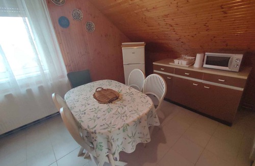 The detached holiday home is furnished in a modern and functional style. Also due to its quiet location the domicile is popular. Available for your exclusive use: barbecue facilities, terrace, garden furniture and courtyard.LocationBalatonföldvár. The holiday home is located on a 200 sqm enclosed garden plot with meadow and trees, bordered by a fence. The landlord does not live in the house or on the property. Access is via a side road (asphalted). Parking (for 2 cars) is available on the property. Specialcentral heating (gas).Facilities: internet access (WLAN). TV reception takes place via electric wire. TV channels only in local language. Dogsnot allowed. DistancesShopping 500 m, restaurant 650 m, town center 500 m. In summer: Balaton 1000 m in Balatonföldvár (beach 1000 m in Balatonföldvár featuring meadow). DivisionHoliday home, 2 floors, 6 rooms (including 5 bedrooms), 200 sqm, in total 14 beds. RoomThe entrance to your holiday home is located on the ground floor and leads over an external staircase and the 20 sqm terrace directly into the kitchen-diner.Ground floor: Living room with sitting area, TV, tiled stove and access to the terrace. Bedroom with 1 double bed. Bedroom with 2 single beds and 1 bunk bed. American kitchen with dining area (6 seats), electric stove (ceramic hob, 4 plates), oven, dishwasher, fridge (200 l, icebox), microwave, coffee machine, toaster and electric kettle. Bathroom with bathtub, washing machine, shower, 1 washbasin and window. Separate toilet with 1 washbasin, WC and window. Top floor: Bedroom with 3 single beds. Bedroom with 3 single beds and access to the balcony (garden furniture, 1 table, 6 chairs). Bedroom with 1 double bed. Kitchen with dining area (6 seats), gas stove (3 flames), oven, fridge (150 l, icebox), microwave and coffee machine. Bathroom with washing machine, shower and 1 washbasin. Separate toilet with WC. Terms of lease and pricesIncluded in the priceinternet access, parking place, washing machine, electricity, water, final cleaning, bed linen, hand towels, bathing towels, Wireless Internet access. Side costs-Costs on the spot:/Obligatory:local tax by local tariff.Deposit:EUR 150,-/object