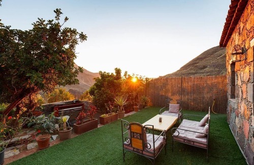 The pool (maintained year round, but not heated; depth of 1.50 m) is cleaned by salt electrolysis and offers views of the Teide on clear days. Enjoy star gazing at night. In El Risco, accessible on foot, you can reach a small shop and a cafe/bar/restaurant. Supermarkets, shops, ATMS and numerous restaurants can be found at the fishing harbour in the old town of Agaete, 15 km from the property. El Risco, 150 m above sea level and protected from the elements by the mountains, has one of the best microclimates on the island. You can start your hike on your front door. It is 45 minutes to Charco Azul, a waterfall, and an hour to Tirma, Faneque and the pine forest of Tamadaba.The spacious patio, on the south side of the house, faces the garden and is furnished with a table and chairs and a sun shade; at the western end of the patio is an upholstered seating accommodation. The 100 year old trees are a refuge for birds and offer welcome shade.