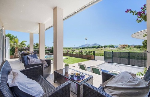The detached villa, built in the year 2013, is located in a residential neighbourhood outside of the town centre of Alcudia, near the coast. The house can accommodate up to ten people on 220 m², spread over two floors. It is ideal for families with children.