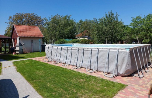 The holiday home with pool is located in Balatonmariafürdö on the south shore for your exclusive use.700 square metres of enclosed garden with a partial hedge and completely surrounded by a fence and house wallPool: Pool dimensions 7.32 x 3.66 x 1.32 Pool maintenance and service is provided by the landlord who will be happy to help you with any questions. Pool open continuously from the beginning of May to the end of September Garden equipment: Garden tables, garden chairs and barbecue area and a covered garden pavilion Garden swing. There are also several secure parking spaces in the property (outdoor area). The house is designed for up to 6 people and comprises approx. 90 square metres of living space: Dining room for 6 people, German-language satellite TV can be darkened (roller blinds) Kitchen: A functional kitchen, 4-burner electric hob and oven, extractor bonnet, fridge with freezer compartment, microwave, coffee machine, toaster, kettle and dishwasher. Please bring your own tea towels and hand and bath towels. 3 bedrooms with 3 queen-size beds each, bathroom: very nice bathroom with shower, washbasin, bidet and WC, with daylight through a window, washing machine for a fee per wash cycle Surroundings: in a quiet side street, shops and restaurants nearby all year round, thermal baths in Zalakaros, Csiztapuszta and Heviz also within easy reach and also all weekly markets.